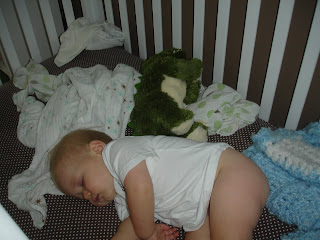 *rolls all over his bed and on the floor when we aren't watching, but rarely goes anywhere if we are paying attention- we sneak and peek over his crib to see him